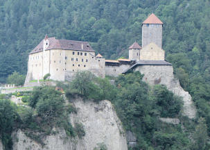 Schloss Tirol Die Burg bei Dorf Tirol nahe Meran liegt auf einem Hügel im Norden des Meraner Beckens inmitten von Weinbergen. Der freie Blick reicht weit in das Etschtal gegen Süden und in den Vinschgau gegen Westen. Der Name Tirol hängt mit dem lateinischen Wort "terra" zusammen (Gebiet, Boden). Die Anfänge der Anlage gehen auf das 11. Jahrhundert zurück. Was wir heute sehen, entstand in mehreren Bauphasen. Als Stammburg der Grafen von Tirol gab sie dem unter Graf Meinhard II. im 13. Jahrhundert entstandenen Land den Namen. Vom 12. bis zum 14. Jahrhundert befand sich hier die Residenz der Landesfürsten und damit das politische Zentrum Tirols. Mit der Übergabe Tirols an die Habsburger unter Margarete Maultasch im Jahre 1363 verlor die Burg ihre Bedeutung. Als im Jahre 1420 Herzog Friedrich IV. mit der leeren Tasche den Regierungssitz nach Innsbruck verlegte, begann der Niedergang der Burg. Im 16. Jahrhundert war sie praktisch nicht mehr bewohnbar und wegen des leicht abrutschenden Moränengrundes stürzten wesentliche Gebäudeteile des östlichen Abschnitts in die Tiefe. Erste umfassende Restaurierungen sind ab 1880 nachweisbar und wurden im 20. Jahrhundert fortgesetzt. Seit 2003 ist hier das Südtiroler Landesmuseum für Kultur- und Landesgeschichte untergebracht. Archäologische Grabungen haben sehr viele Details zutage gebracht. Schloss Tirols steht als großes Symbol für die kulturelle Einheit des Landes. Der mächtige Bergfried wurde im Norden errichtet, an der von der Natur am wenigsten geschützten Stelle. Palas und Kapelle liegen im Süden. Zwischen diesen Hauptgebäudeteilen liegen der Ostpalas mit dem Wehrgang, die Wirtschaftsgebäude und die Ringmauer, die einen langgestreckten Innenhof umgrenzen. Der Eingang liegt im Südwesten. Der Besucher fährt mit dem Auto nach Dorf Tirol und gelangt von dort zu Fuß in rund 20 Minuten zum Schloss. Von besonderer Kostbarkeit sind die zwei romanischen Portale am Eingang zum Palas und von dort zur Kapelle. Sie zeigen verschiedene Darstellungen von Adeligen, Fabelwesen, Mischwesen zwischen Mensch und Tier sowie Dämonen, sind um 1138 zu datieren und zählen zu den schönsten Beispielen romanischer Kunst in Tirol. In der Kapelle steht heute eine Kopie des berühmten Altars von Schloss Tirol (gotischer Flügelaltar aus dem 14. Jahrhundert). Das Original befindet sich im Tiroler Landesmuseum Ferdinandeum in Innsbruck.