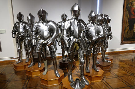 Schloss Ambras und seine Kunstschätze Lange bevor Innsbruck gegründet wurde, gehörten Teile des Inntals und das Wipptal den bayerischen Grafen von Andechs. Sie errichteten auf einer Anhöhe im Süden des Tales die Burg Ambras. Hier führten ein Zweig der Römerstraße und ein Arm des Inns vorbei. Als im Jahre 1133 diese Burg in einem Kampf zerstört wurde, siedelten die Andechser auf der Nordseite des Inns im Gebiet der heutigen Innsbrucker Stadtteile St. Nikolaus und Mariahilf. 1180 tauschten sie mit dem Stift Wilten ein Stück Land südlich der Innbrücke ein - dort entstand die Altstadt. Sie gelten als die Gründer von Innsbruck. Die Burg Ambras verfiel langsam. Erzherzog Ferdinand II. ließ für seine erste Gattin Philippine Welser in den Jahren um 1570 ein prächtiges Renaissanceschloss errichten, in dem beide viel Zeit verbrachten. Schloss Ambras ist von einem weiten Park umgeben und besteht aus drei Teilen: Unterschloss mit den drei Rüstkammern, der ehemaligen Kornschütt mit der Kunst- und Wunderkammer sowie dem Antiquarium Hochschloss mit den Wohngebäuden und einem rechteckigen Hof Spanischer Saal mit Garten Von den umfangreichen Sammlungen Ferdinands sind nur mehr Teile erhalten, darunter Rüstungen, Waffen, Porträts, Kunstgegenstände, allerlei Kurioses und Ungewöhnliches aus Natur und Technik, Bücher etc. Solche Objekte sind in den Räumlichkeiten des Unterschlosses zu bewundern. Dabei ist etwa der sogenannte Fangstuhl: Gäste wurden dort festgehalten und erst wieder befreit, wenn sie eine gewisse Menge Wein getrunken hatten. Zu den Kuriositäten gehörten Kunstwerke aus Korallen, ausgestopfte Fische sowie das Porträt eines Adeligen, dessen Kopf von einer Lanze durchbohrt wurde und der noch rund ein Jahr lebte. Die Abbildung rechts zeigt die Rüstung des 2,40 m großen Riesen Giovanni Bona, genannt Bartlmä Bon. Im Hochschloss befindet sich die Habsburgergalerie mit Porträts von Mitgliedern der Herrscherfamilie sowie andererer europäischer Adelsfamilien. Dabei sind etwa Darstellungen von Kaiser Maximilian I. und der Maria Theresia. Weiters befinden sich dort das Bad der Philippine Welser und verschiedene mittelalterliche religiöse Kunstwerke. Als einer der schönsten Renaissancesäle nördlich der Alpen gilt der Spanische Saal mit einer Holzkassettendecke und Wandmalereien von Tiroler Landesfürsten sowie Mitgliedern der Familie Habsburg. Hier fanden einst rauschende Feste statt. Heute ist wird der Saal im Sommer für Konzerte verwendet. Als begeisterter Jäger konnte der Erzherzog in der Umgebung des Schlosses im weiten Park und den Wäldern diesem Vergnügen nachgehen.