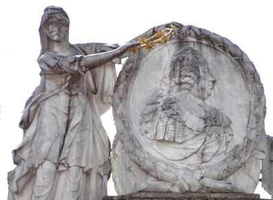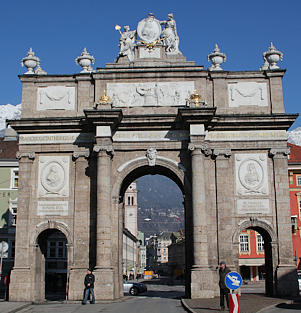 Die Triumphpforte in Innsbruck Huldigungs- und Begrüßungspforten wurden im Laufe der Geschichte immer wieder errichtet und gehen in ihren Ursprüngen auf die Antike zurück. Besonders beliebt waren sie im Barock. Aus Anlass der Hochzeit Erzherzog Leopolds mit der spanischen Prinzessin Maria Ludovica im Jahre 1765 wurde zu Ehren der kaiserlichen Familie und der jungen Braut am südlichen Ausgang der Vorstadt (heutige Maria- Theresien-Straße) eine Ehrenpforte errichtet. Die Südseite des Denkmals erinnert an das freudige Ereignis der Hochzeit. Leider starb im Zuge der Festlichkeiten Kaiser Franz I. Stephan von Lothringen, weshalb die Gestaltung der Nordseite an seinen Tod erinnert. Im Zuge der Hochzeitsvorbereitungen und des Besuchs der kaiserlichen Familie fanden in Innsbruck zahlreiche Renovierungsarbeiten statt. So wurden etwa der Stadtgraben zugeschüttet und das zu enge Vorstadttor am Ausgang der Altstadt zur Maria-Theresien-Straße abgebrochen. Aus den Quadern dieses Tores entstand die heute noch vorhandene Triumphpforte. Entwurf und Bauleitung hatte Constantin Walter inne, der Schmuck wurde zunächst von Johann Hagenauer aus Holz und Gips gefertigt und einige Jahre später von Balthasar Moll in Marmor ausgeführt. Südseite Die Aufsatzgruppe zeigt links einen Genius und die Figur der Vorsehung, die ein ovales Reliefbild mit der Darstellung von Kaiser Franz I. Stephan von Lothringen und Maria Theresia im Lorbeerkranz halten. Das Mittelrelief der Attika darunter stellt die Vermählung auf dem Altar der Liebe dar, während Hymenäus die Fackel entzündet. Über dem linken Seitentor befindet sich eine Profildarstellung des Hochzeitspaares (Leopold und Maria Ludovica), über dem rechten Seitenbogen das Doppelporträt der Erzherzoginnen Anna und Maria Christina, beide Schwestern des Bräutigams, die bei der Hochzeit anwesend waren. Über den beiden Säulen beiderseits des Mittelbogens sind links der österreichische Erzherzogshut und rechs die böhmische Wenzelskrone abgebildet. Nordseite Die Aufsatzgruppe besteht aus dem Porträtmedaillon Kaiser Franz I., über dem die Figur der Unsterblichkeit den Sternenkranz hält. Rechts wendet sich Saturn mit gesenkter Sense trauernd ab. Das Attikarelief stellt die trauernden verwaisten Künste und Wissenschaften dar. Im Torbogen sind die Porträts der Herzogin Karoline von Lothringen und des Herzogs Karl von Lothringen dargestellt, Verwandte von Franz Stephan.