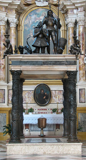 Das Grabmal im Dom von Innsbruck Das von Kaspar Gras entworfene und von Heinrich Reinhart in Innsbruck gegossene Grabmal wurde 1629 in der alten Kirche aufgestellt, im barocken Bau dann jedoch getrennt links und rechts im Chor über den beiden Sakristeitüren. Erst 1948 kam es zur heutigen Aufstellung. Die sterblichen Überreste von Erzherzog Maximilian III. d. Dtm. befinden sich jedoch im Chor vor dem Hochaltar. Der kniende Erzherzog wird vom stehenden hl. Georg, Ritterpatron und bis 1772 Tiroler Landespatron, beschützt. Zum Heiligen gehört laut Legende der Drache. Besonders schön gestaltet sind die gewundenen Säulen mit ihrem köstlich modellierten Schmuck (Weinreben, Vögel, Raupen, Schnecken etc.). Es ist ein Werk des Manierismus (Stil zwischen Renaissance und Barock, bei dem es vor allem um Entfremdung geht). Bestattet wurde im heutigen Dom auch der Habsburger Erzherzog Eugen (gest. 1954), Hochmeister des Deutschen Ordens und Oberbefehlshaber der österreichischen Truppen in Südtirol im Ersten Weltkrieg. An ihn erinnert ein Denkmal links vom Haupteingang zum Hofgarten.