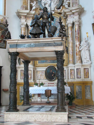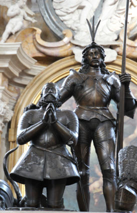 Erzherzog Maximilian III. der Deutschmeister (Standardtext) Da Erzherzog Ferdinand II. keine erbberechtigten Söhne hatte, übernahm nach seinem Tod der Kaiser in Wien die Regierung über Tirol und die Vorlande. Dieser schickte seinen Bruder Erzherzog Maximilian III. zunächst als Statthalter (= anstatt des Kaisers) nach Tirol. Später wurde Maximilian selbständiger Tiroler Landesfürst. Der Erzherzog war unverheiratet und Mitglied des Deutschen Ordens, stand diesem als Hochmeister sogar vor. Der Deutsche Orden wurde während des dritten Kreuzzugs im 12. Jahrhundert im Heiligen Land von norddeutschen Kaufleuten gegründet. Die Mitglieder kümmerten sich um erkrankte und verwundete Kreuzfahrer und Kaufleute, später um die Bekehrung Andersgläubiger. Da der Erzherzog sehr religiös war, förderte er den Bau von Klöstern in Tirol, etwa des Servitenklosters in Innsbruck. Er selbst zog sich gerne zum Gebet und zur Meditation in die Einsamkeit zurück, wozu er sich die sogenannte Eremitage errichten ließ, grottenartige Räume im Bereich des Kapuzinerklosters. Auf ihn geht auch in Innsbruck der Bau eines Gymnasiums zurück, das die Jesuiten führten. Nachfolger ist das heutige Akademische Gymnasium. Das Grabmal Maximilians befindet sich im linken Querschiff des Doms von St. Jakob in Innsbruck, bestattet liegt er jedoch vor dem Hochaltar. Vier gedrehte Bronzesäulen tragen einen Baldachin, auf dem eine Figur des Landesfürsten, begleitet vom hl. Georg mit dem Drachen, kniet. Der hl. Georg ist heute nach dem hl. Josef der zweite Tiroler Landespatron.