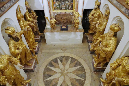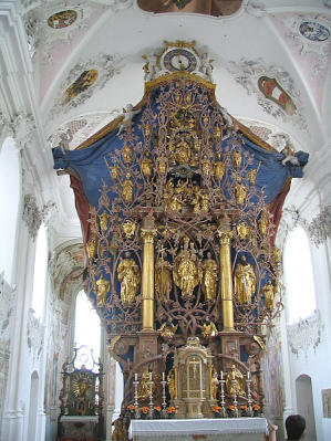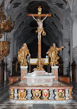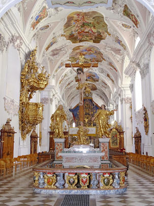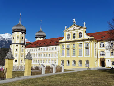 Stift Stams - Grablege der Tiroler Landesfürsten Stift Stams liegt im Oberinntal etwas westlich von Telfs und gehört dem Orden der Zisterzienser. Bekannt ist Stams vor allem als Begräbnisstätte der Tiroler Landesfürsten, aber auch auch wegen seines Schigymnasiums. Im Jahre 1273 gründeten Graf Meinhard II. von Tirol-Görz und seine Gattin Elisabeth das Kloster Stams als Grablege der Tiroler Landesfürsten. Damals entstand eine große romanische Kirche, die im 17. und 18. Jahrhundert von Mitgliedern der Tiroler Baumeisterfamilie Gumpp im Barockstil umgebaut wurde. Damals wurde auch das Kloster barockisiert. Besonders wertvoll ist der frühbarocke Hochaltar vom süddeutschen Künstler Bartlmä Steinle (gest. 1628), der einen Lebensbaum mit 84 Figuren, ausgehend von Adam und Eva, darstellt. Auffallend ist auch der Stuck des Wessobrunner Künstlers Franz Xaver Feichtmayr. Im Kloster Wessobrunn in Südbayern war im Barock eine Stuckateurschule beheimatet und zahlreiche Künstler arbeiteten auch in Tirol. Johann Georg Wolcker, der Maler der Deckengemälde, stammt ebenfalls aus Südbayern. Schon beim Betreten der Kirche sieht man ganz hinten das Österreichische Grab mit der großen Kreuzigungsgruppe des Oberinntaler Künstlers Andreas Thamasch. Sowohl hier im westlichen Bereich der Kirche als auch vorne im Chorbereich sind zahlreiche Tiroler Landesfürsten begraben, so etwa Herzog Friedrich IV., Erzherzog Sigmund der Münzreiche, Graf Meinhard II., Elisabeth von der Pfalz, Bianca Maria Sforza - zweite Gattin von Kaiser Maximilian I. und andere.