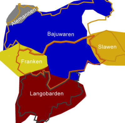 Völkerwanderung (Standardtext) Die Flüsse Rhein und Donau bildeten eine natürliche Grenze für die Römer am nördlichen und nordöstlichen Rand ihres Reiches. Die Völker, die jenseits dieser Grenze lebten, begannen zu wandern. Geänderte Klimaverhältnisse und eine Zunahme der Bevölkerung sind als Ursache für diese Wanderungen zu sehen. Wir sprechen von der Zeit der Völkerwanderung. Im 4. Jh. gaben die Römer unter dem Druck der einfallenden Germanen das Alpenvorland auf. Verschiedene Völker drangen in die Alpentäler ein und zerstörten etwa zweimal die Römerstadt Aguntum bei Lienz. Odoaker und Theoderich gründeten in Italien Germanenreiche (476-552), konnten jedoch nur wenig Einfluss auf die Alpengebiete ausüben. Tirol spielte als Durchgangsland für verschiedene germanische Völker eine wichtige Rolle. Im Süden unseres Landes zogen sich die besiegten Goten zurück. Der große Ostgotenkönig Theoderich lebt bei uns als Dietrich von Bern (Verona) in verschiedenen Sagen (König Laurin) weiter. In der zweiten Hälfte des 6. Jahrhunderts gelangten die Langobarden von Osten her nach Italien. Ihr Königreich erstreckte sich von der Lombardei bis in die Gegend von Bozen. Sie trafen auf die aus dem Norden eindringenden Franken. Um 575 wird von einer Auseinandersetzung von Langobarden und Franken bei Salurn berichtet. Unter Kaiser Karl dem Großen kam es in der 2. Hälfte des 8. Jahrhunderts zur Einverleibung der Langobarden in das Frankenreich. Zwischen 550 und 590 drangen die Bajuwaren von Norden hier in das tirolische Inntal ein und ließen sich ohne große Kämpfe neben der rätoromanischen Bevölkerung nieder. Beide Völker lebten friedlich nebeneinander. Um 590 gelangten sie weiter durch das Wipptal und über den Brennerpass in das mittlere Eisacktal und das Pustertal. Mit Unterstützung der fränkischen Könige konnten sie ihr Siedlungsgebiet gegen die von Osten eindringenden Slawen sichern. Um 610 unterlagen die Slawen bei Aguntum. Im Süden wurde das Gebiet im Eisack- und Etschtal erfolgreich gegen die Langobarden verteidigt. Die Bajuwaren rodeten große Gebiete für neuen Siedlungsraum. Die von ihnen gegründeten Siedlungen erkennt man an den Endungen -ing (Inzing, Mieming, Hötting u. a.). Von Nordwesten her wanderten die bajuwarischen Alemannen nach Tirol ein. Im 8. Jahrhundert war der Großteil des späteren Tirol Besitz der Bayernherzöge, die wiederum den mächtigeren Franken unterstanden. Vermutlich gehörte der Vinschgau zum fränkischen Teil Rätiens. Lienzer Becken und Iseltal im Südosten waren von den Slawen besiedelt. Das Gebiet südlich von Bozen gehörte zum langobardischen Königreich. Da die Bayernherzöge zu mächtig wurden, setzte Kaiser Karl der Große Herzog Tassilo III. ab und gliederte im Jahre 788 das bayerische Stammesherzogtum dem Frankenreich an. Zudem erfolgte eine Einteilung in Grafschaften. Grundsätzlich war damit eine Orientierung nach Norden verbunden. So kamen etwa die neuen Missionare aus Bayern und nicht mehr aus dem Süden. Die Urbevölkerung Tirols, die Räter, hatten sich mit den Römern vermischt, aus ihnen waren die Rätoromanen entstanden. Diese übernahmen die deutsche Sprache. In manchen Gebieten konnte sich jedoch das Rätoromanische halten, so in einigen Gebieten in der Schweiz. Ladinisch, auch eine romanische Sprache, wird noch im Grödnertal und im Gadertal in Südtirol gesprochen sowie im Fassatal im Trentino.